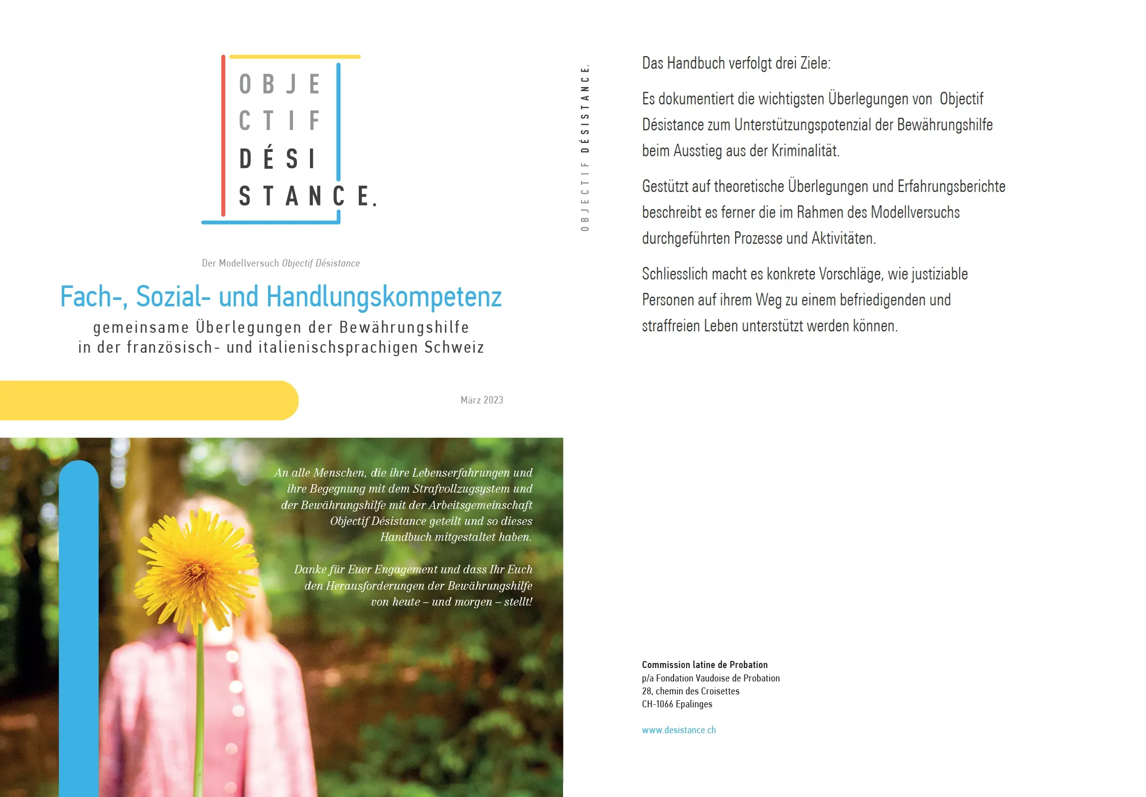 Objectif Désistance bietet ein gemeinsames Betreuungskonzept, das betreute Personen beim Ausstieg aus der Kriminalität unterstützen soll, was gemeinhin als Desistance-Prozess bezeichnet wird. Dieser Prozess beschreibt den individuell-subjektiven Werdegang von Menschen, die sich schrittweise von einer kriminellen Lebensweise entfernen und anfangen, ein geregeltes Leben ohne straffälliges Verhalten zu führen. Objectif Désistance untersucht, wie die verschiedenen Akteur:innen des Strafvollzugs und der Bewährungshilfe, gemeinsam mit der Gesellschaft, justiziable Personen vermehrt auf ihrem Weg zu einem befriedigenden und straffreien Leben unterstützen können.
